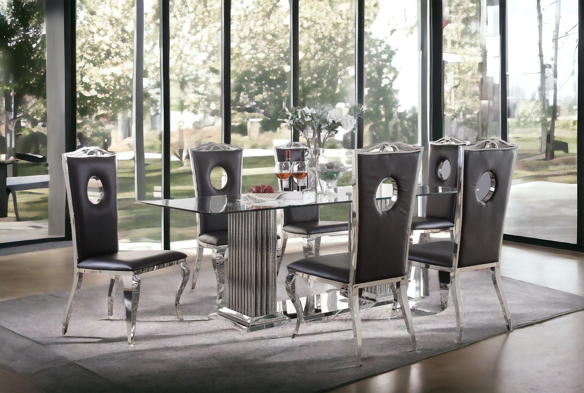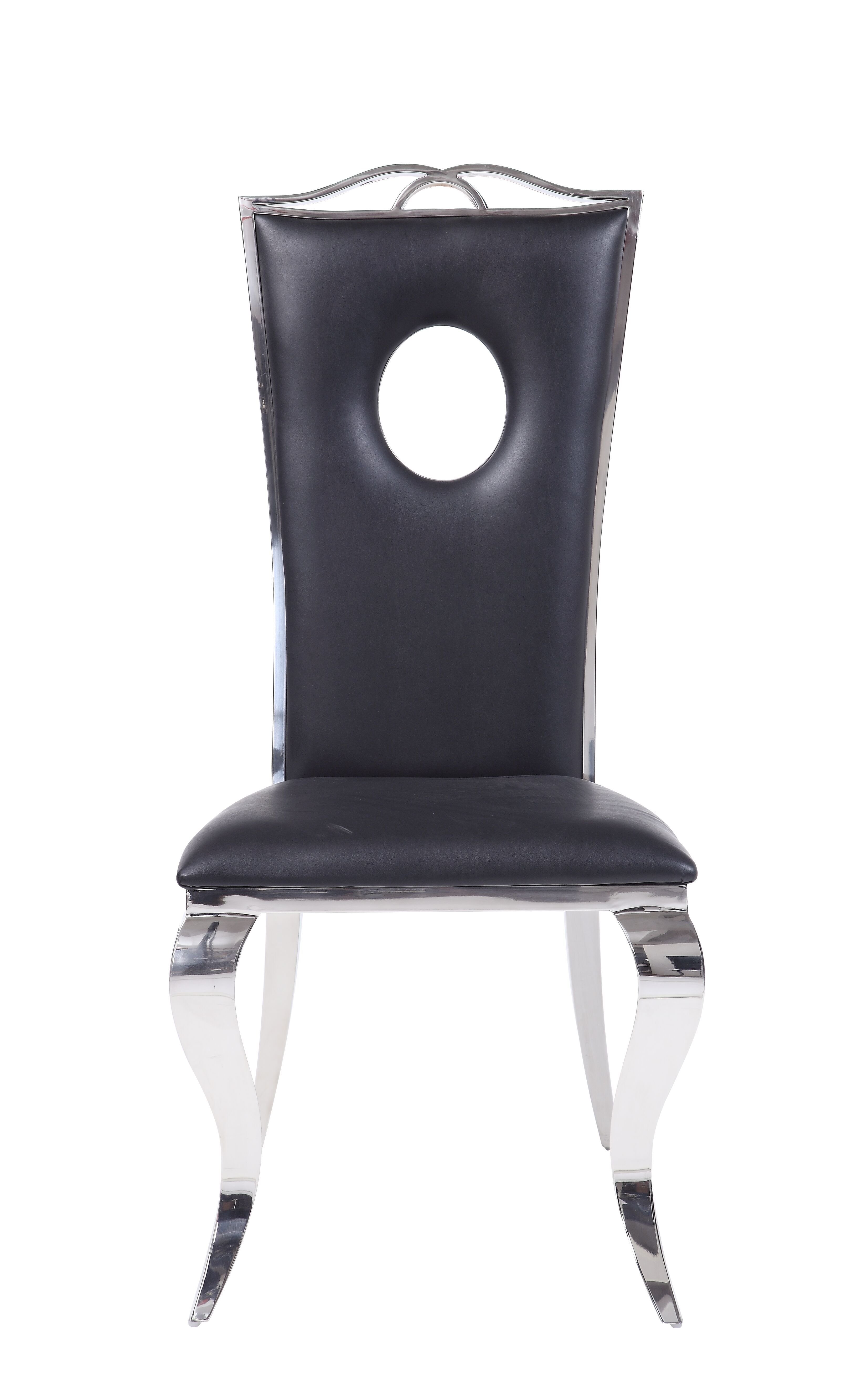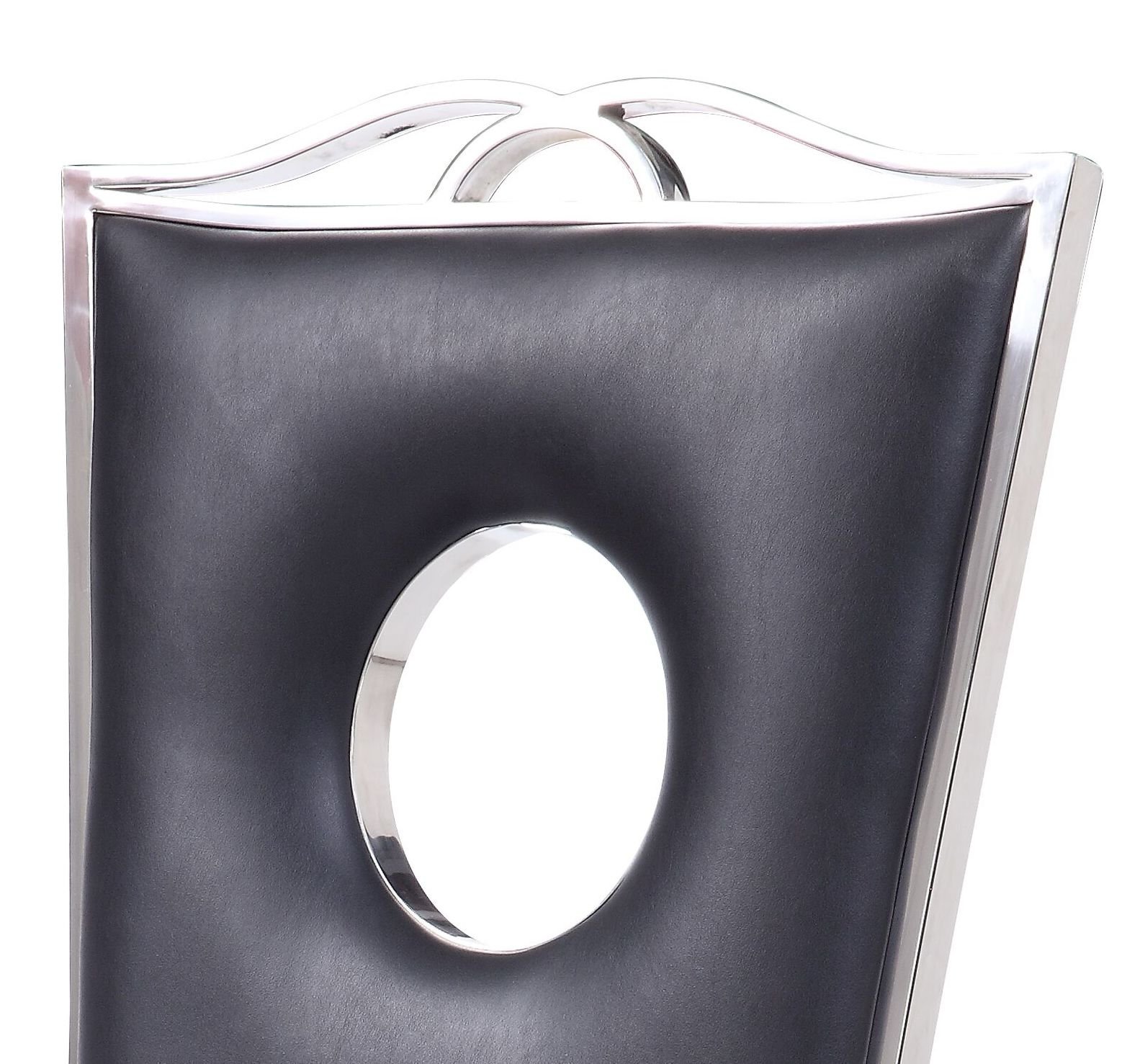 This set of two black and silver dining chairs brings contemporary elegance to your dining space with its sleek cut-out back design. Upholstered in smooth synthetic leather fabric, each chair offers comfortable seating that is easy to maintain and clean. The silver stainless steel frame provides durability and a polished look, while the cabriole-style legs add a refined, modern twist. Designed for both style and support, these chairs are ideal for everyday dining or entertaining guests. Perfect for modern, glam, or transitional interiors, they elevate your dining area with sophistication and comfort.