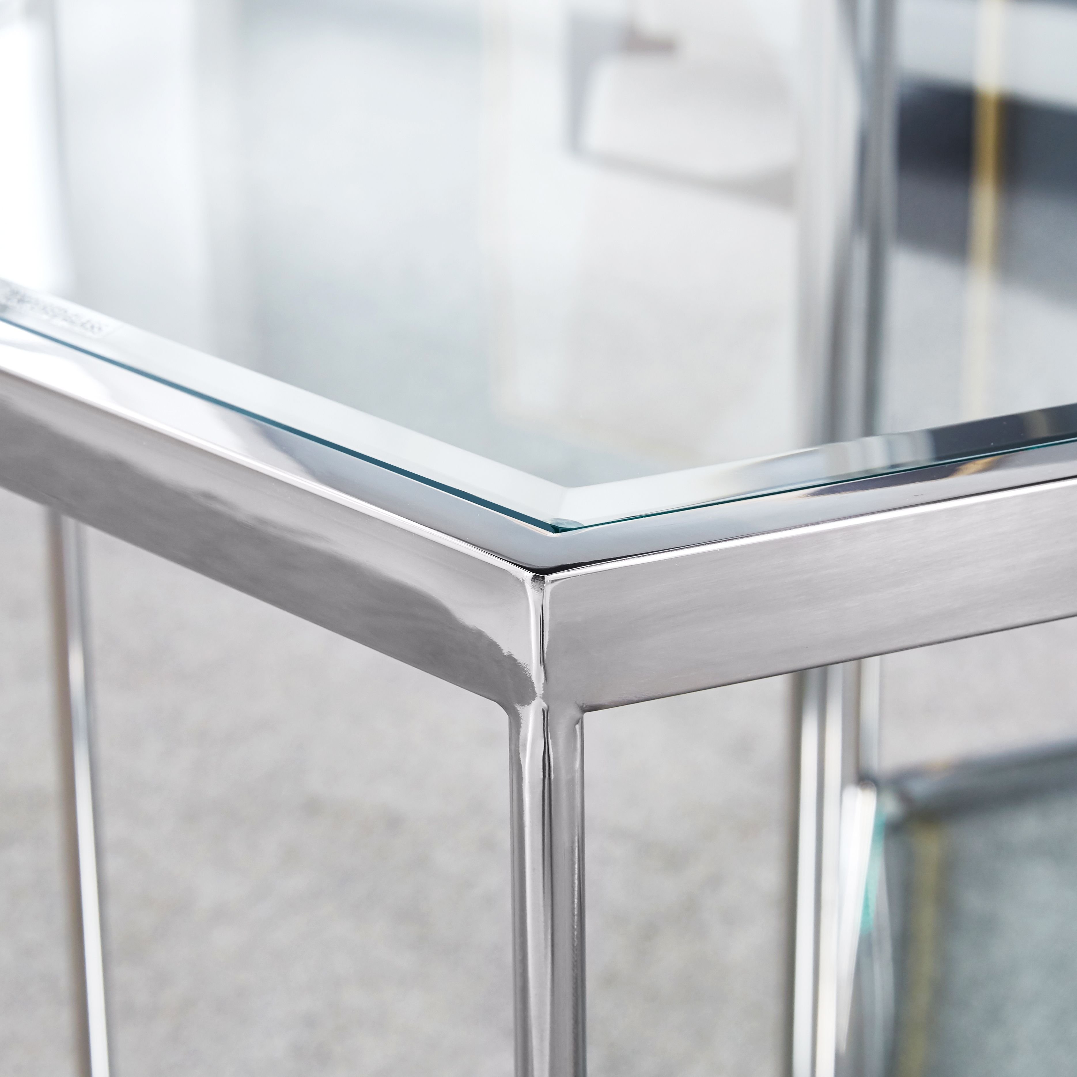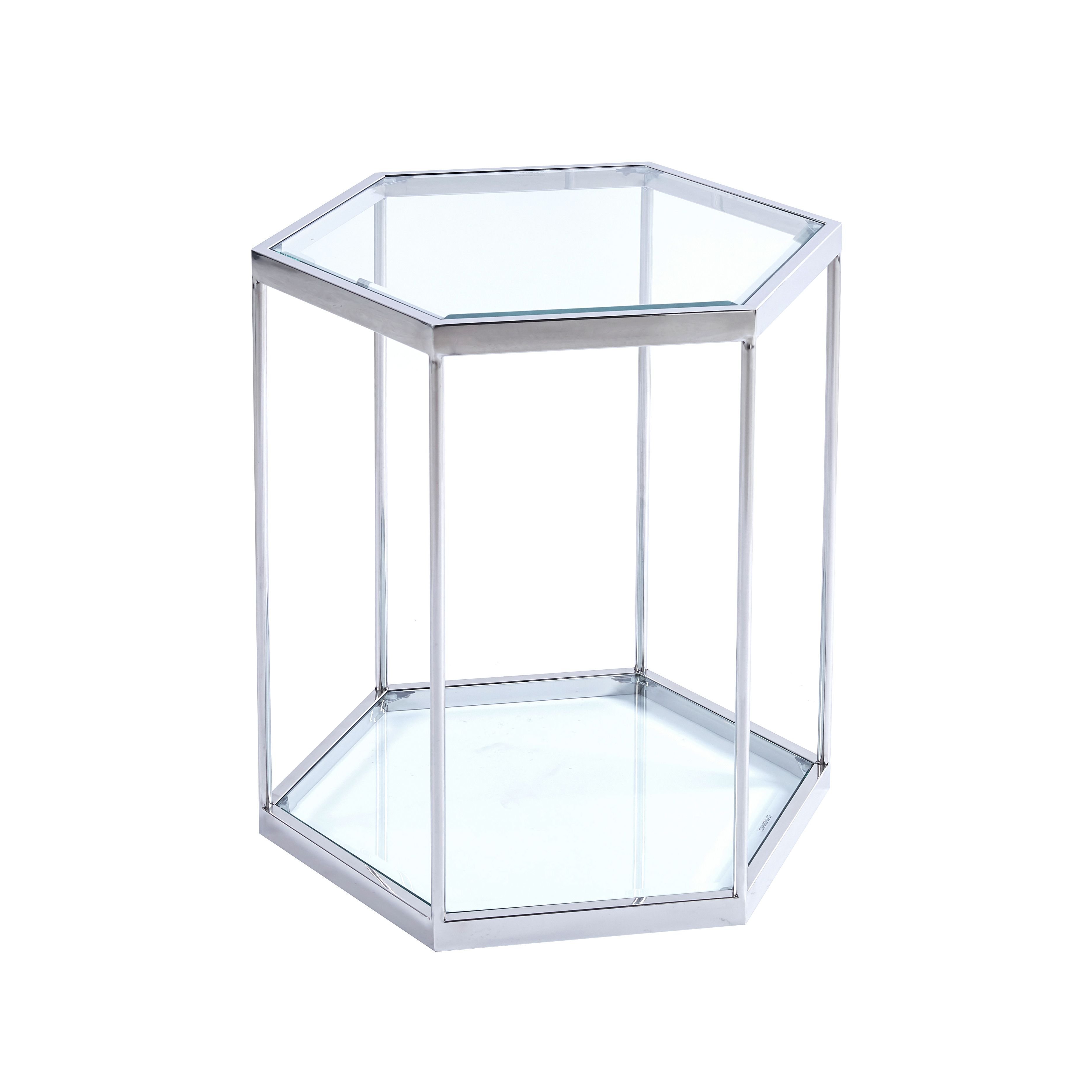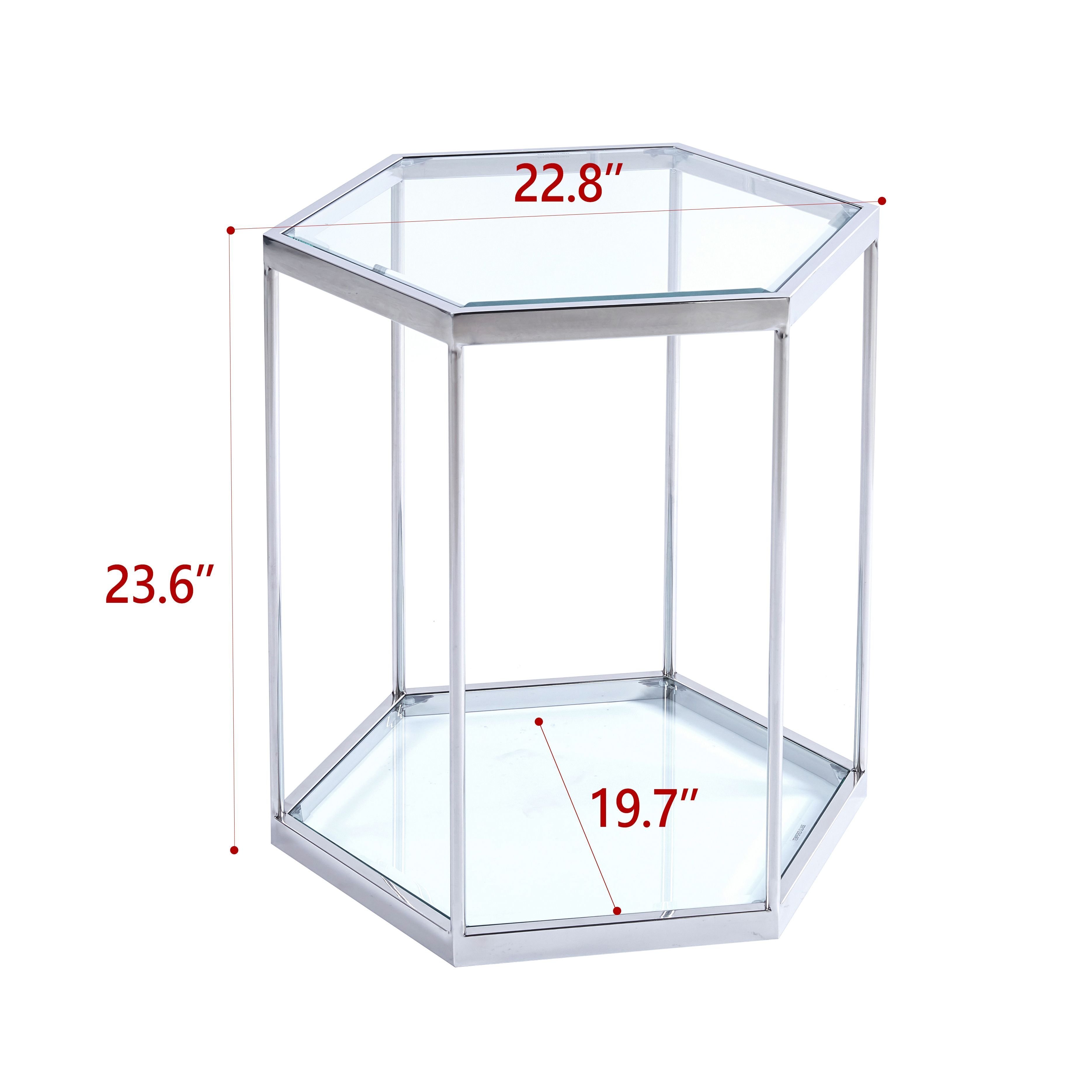 Bring a touch of modern elegance to your living room or bedroom with this octagon-shaped stainless steel end table. The sleek silver finish frame pairs beautifully with the transparent glass tabletop and lower shelf, creating a clean and contemporary aesthetic. Its geometric silhouette adds a bold, modern edge that complements both minimalist and upscale interiors. The dual glass surfaces provide ample space for displaying décor, books, or everyday essentials while maintaining an airy, uncluttered look. Perfect as a side table, accent piece, or nightstand, this versatile end table enhances your space with functional style and sophistication.