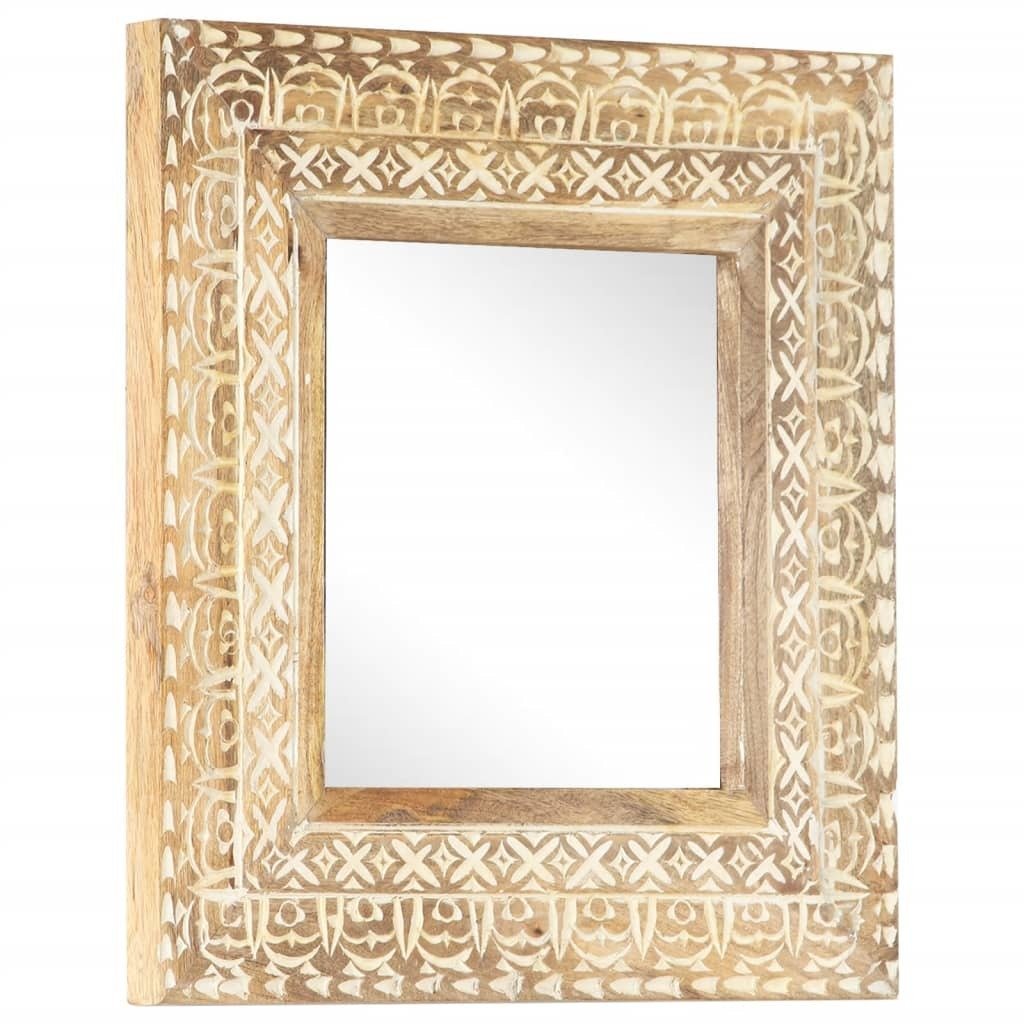 Crafted from solid mango wood, this 19” mirror features intricate hand-carved details that bring artisanal charm to any space. The unique grain and natural color variations ensure no two pieces are exactly alike. Its compact size makes it perfect for accent walls, bathrooms, or entryways. The rustic, organic aesthetic pairs well with bohemian, farmhouse, or eclectic interiors. Built for both beauty and durability, this mirror blends functionality with handcrafted style.
