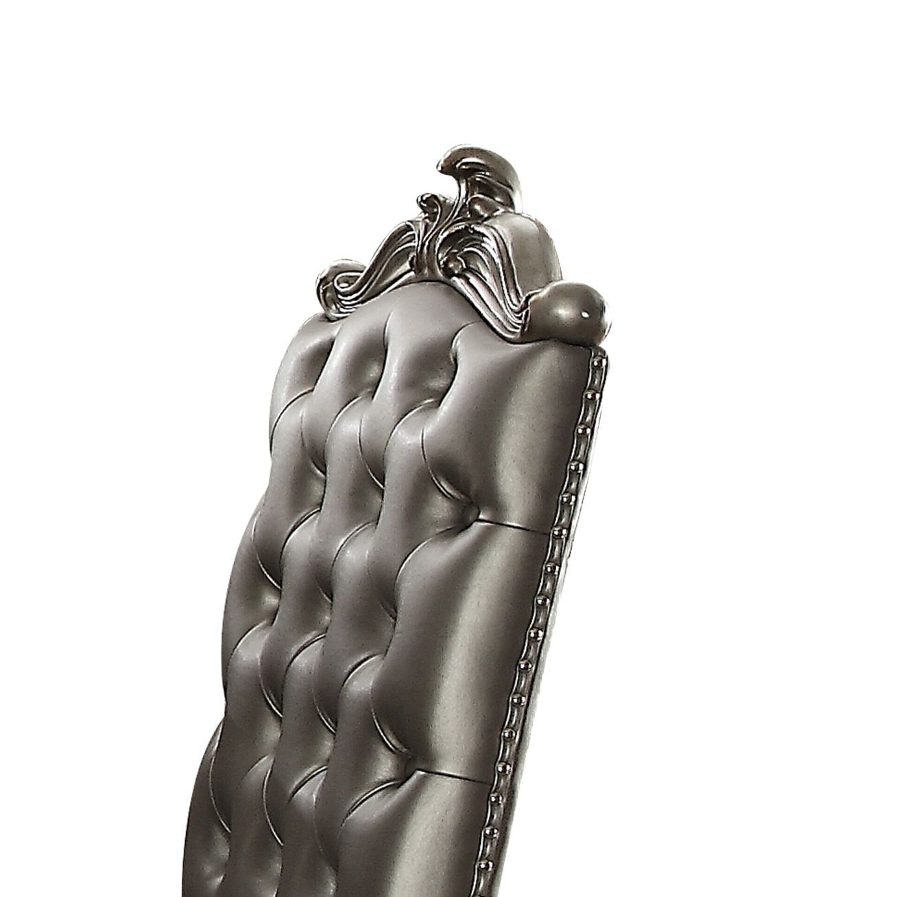 Home > Set of 2, Silver and Antique Platinum Tufted Dining Room Chairs with Intricate Border Detailing, Nailhead Trimming and Button Tufted Backrests