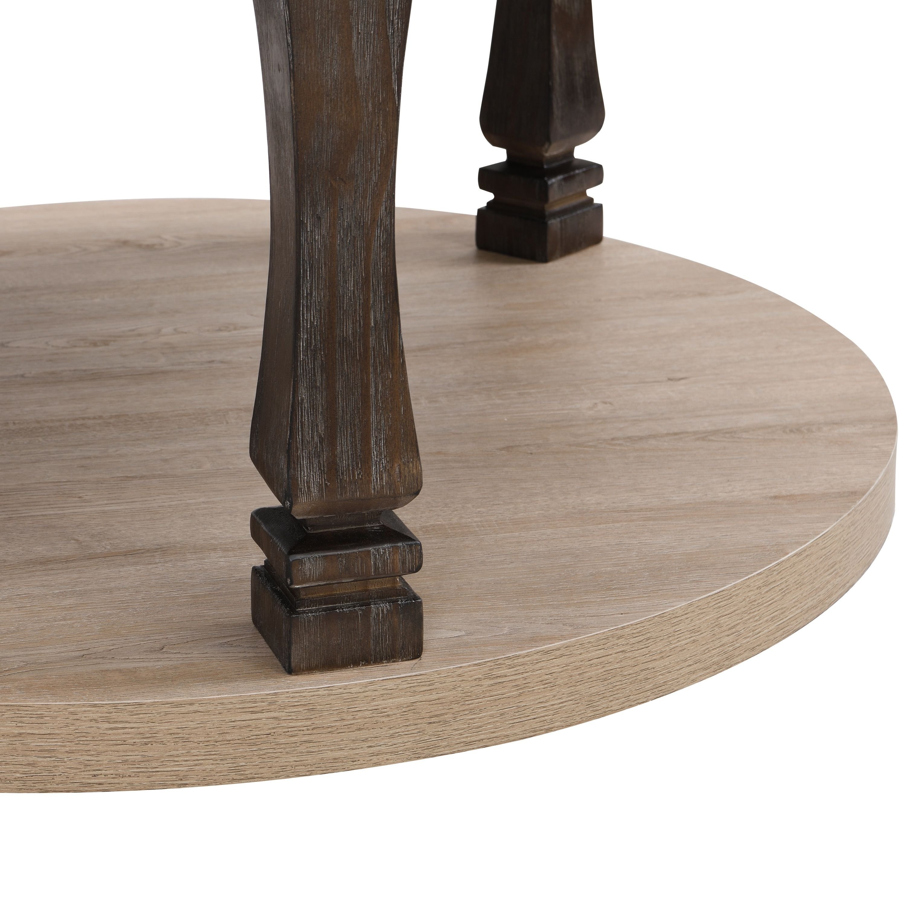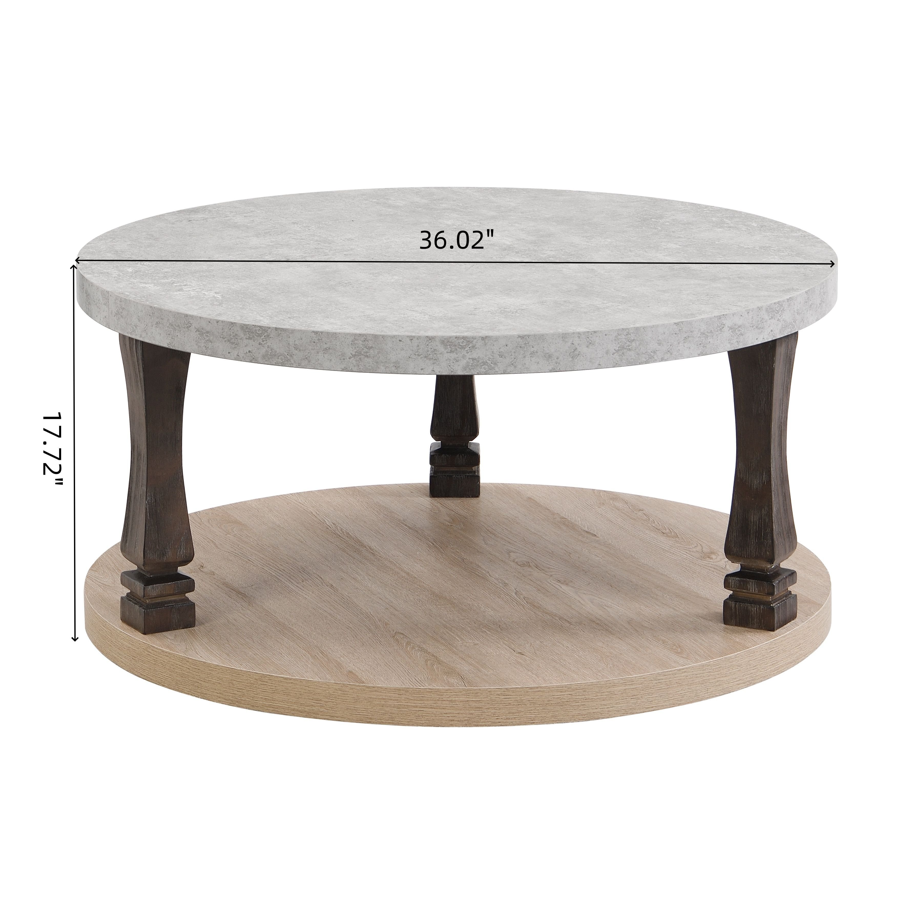 Elevate your living space with this Mid-Century inspired 2-tier round coffee table, combining timeless elegance with modern functionality. The spacious tabletop is perfect for serving or displaying décor, while the open bottom shelf offers convenient storage for books, magazines, or baskets. Its unique Roman column-style legs add a classic architectural touch that enhances its vintage charm. Crafted with a warm wood finish and clean lines, this coffee table effortlessly complements a variety of interior styles from retro to contemporary. Durable and eye-catching, it's both a practical and stylish addition to your home.