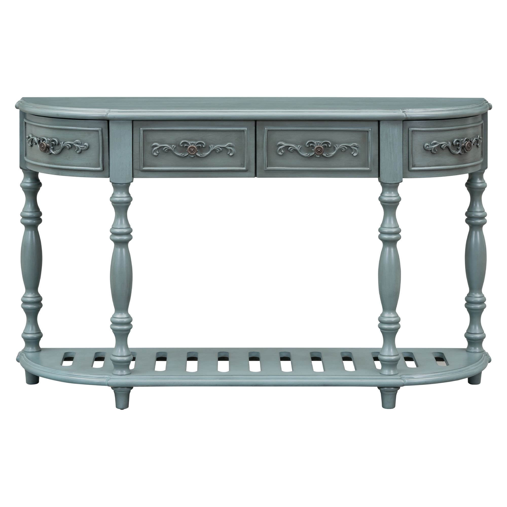 Bring timeless elegance and practical storage to your home with this 52” Contemporary Curved Console Table. Featuring a graceful curved silhouette with antique-style detailing, this versatile piece complements both modern and traditional interiors. The four spacious drawers provide convenient organization for household essentials, while the open bottom shelf is perfect for displaying décor, books, or baskets. Crafted with four sturdy legs for stability, this console table is ideal for your entryway, hallway, living room, or dining area. A sophisticated yet functional addition, it effortlessly blends charm with everyday usability.