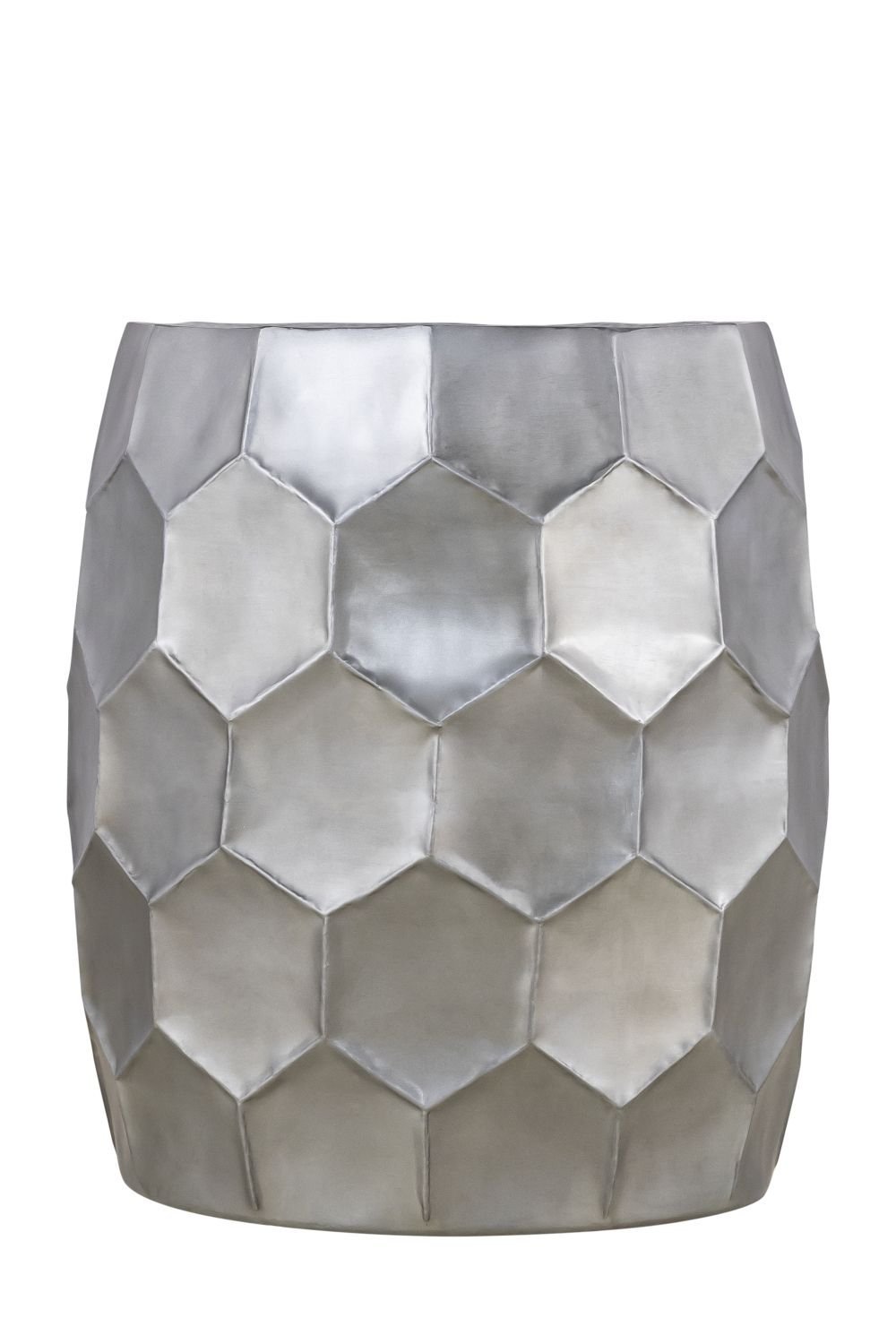 Add a refined touch to your living space with this Antique Silver Modern Contemporary End Table. Crafted from high-quality aluminum, this handcrafted piece showcases a stunning diamond-patterned base that brings depth and character. The glossy antique silver finish offers a perfect blend of vintage charm and modern elegance. Its compact, sculptural design makes it a stylish addition to any room, whether used beside a sofa, bed, or lounge chair. Functional and decorative, it suits a variety of interior styles from chic contemporary to eclectic glam. This end table is a true conversation starter with its sculptural form and premium craftsmanship.