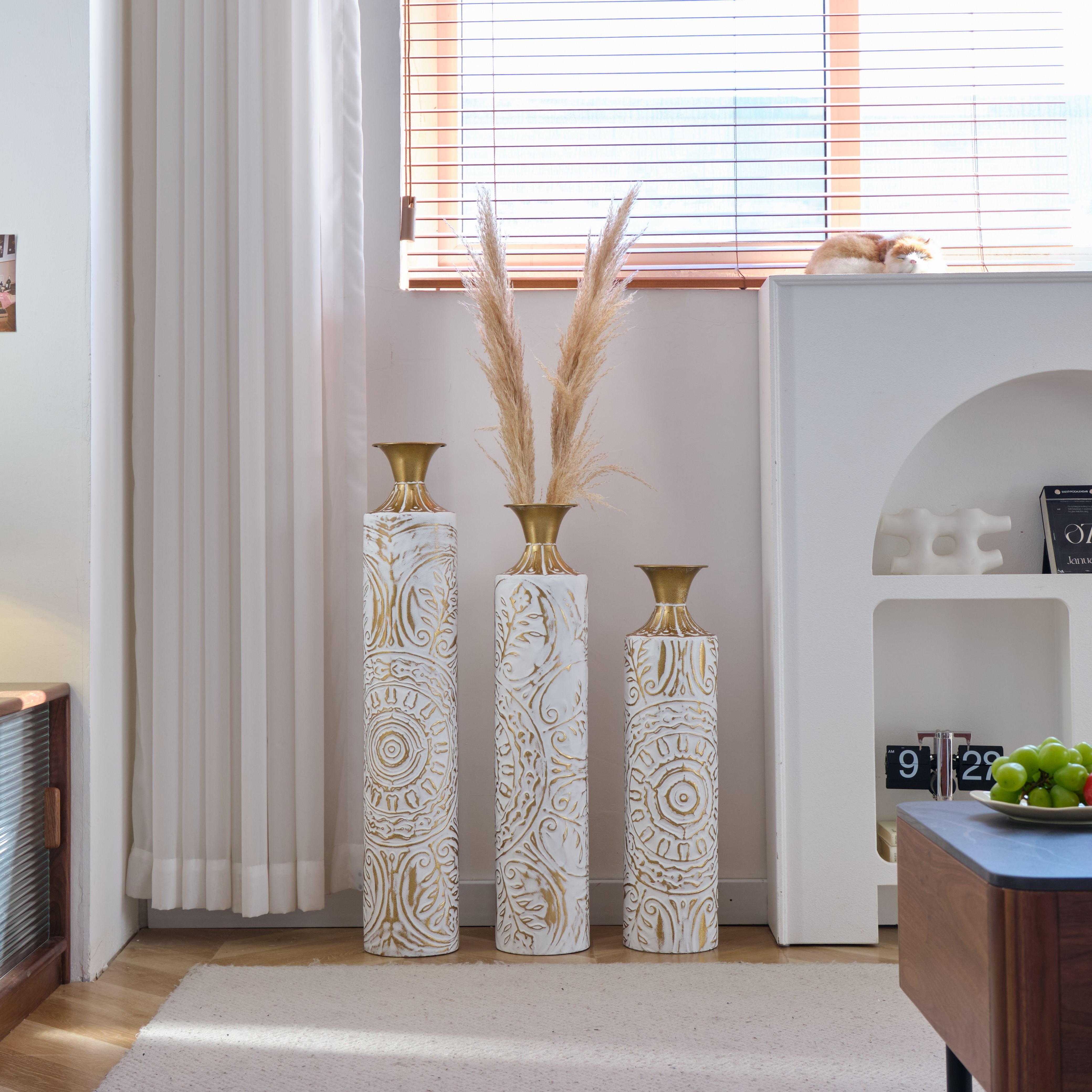 Add sophistication and charm to your home décor with this Set of 3 Handcrafted Metal Floor Vases, designed to enhance any modern or traditional space. Each vase showcases a polished and hammered finish, creating a stunning contrast that captures light beautifully. The cylindrical shape offers balance and elegance, while the funnel-shaped necks add a refined touch that complements floral arrangements or standalone display. Expertly handcrafted, each piece features unique artisan detailing for a distinct character. Perfect for living rooms, entryways, or office spaces, this decorative vase set brings timeless artistry and modern flair together.