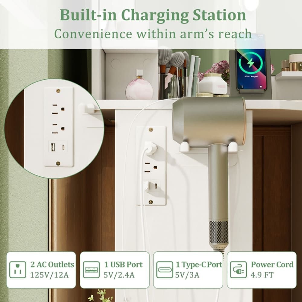 Elevate your beauty and workspace with this multifunctional corner vanity desk, expertly designed for style, storage, and convenience. Featuring a built-in power outlet station, you can easily plug in hair styling tools, chargers, or devices without messy cords. The 5 spacious drawers and 3 open storage shelves provide ample space to organize cosmetics, accessories, and essentials. A 3-color LED light mirror lets you choose the perfect brightness for flawless makeup application, day or night. Complete with a hair dryer rack holder, this vanity desk delivers a sleek, organized setup that maximizes corner space in any bedroom or dressing area.