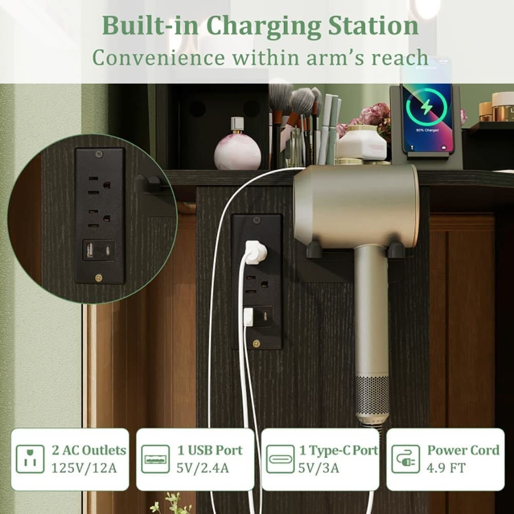Elevate your beauty and workspace with this multifunctional corner vanity desk, expertly designed for style, storage, and convenience. Featuring a built-in power outlet station, you can easily plug in hair styling tools, chargers, or devices without messy cords. The 5 spacious drawers and 3 open storage shelves provide ample space to organize cosmetics, accessories, and essentials. A 3-color LED light mirror lets you choose the perfect brightness for flawless makeup application, day or night. Complete with a hair dryer rack holder, this vanity desk delivers a sleek, organized setup that maximizes corner space in any bedroom or dressing area.