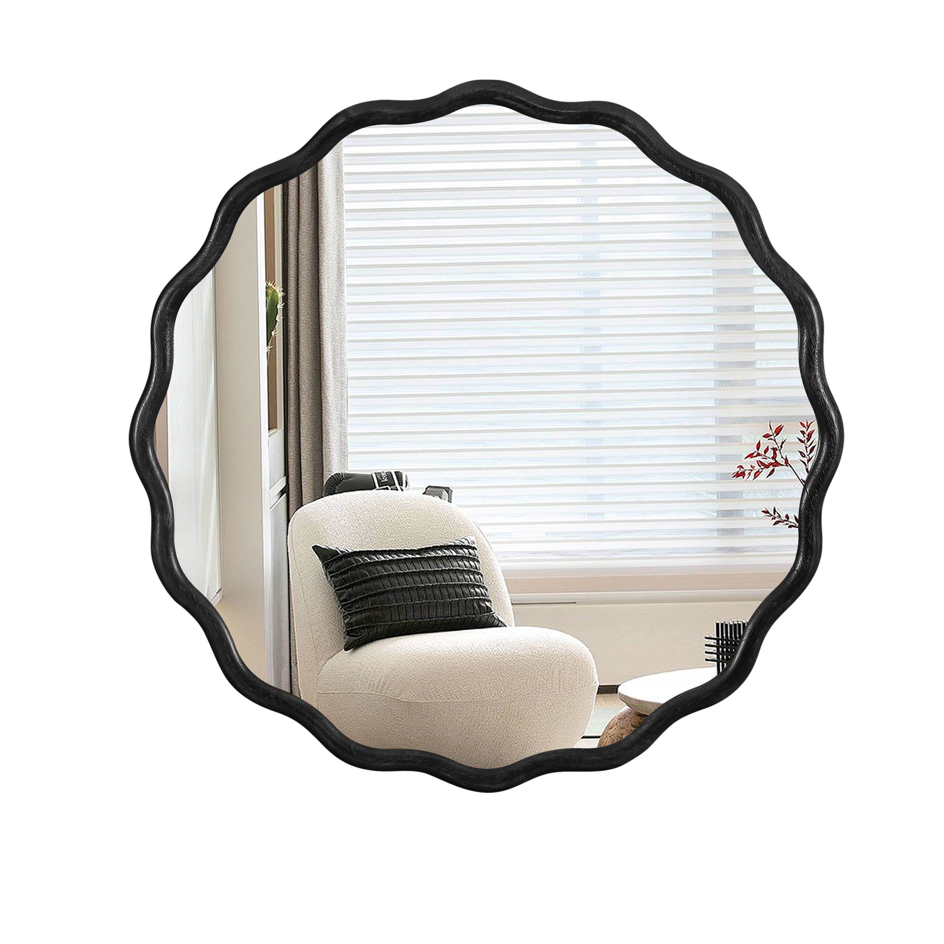 Add a stylish statement to your space with this 36" round modern wall mirror featuring a bold black wavy frame design. The artistic frame adds depth and texture, making it an eye-catching accent in living rooms, bedrooms, entryways, or bathrooms. Its high-definition (HD) reflective surface offers a clear and crisp view, ideal for both practical use and decorative appeal. The generous 36-inch diameter brings balance and proportion to any wall. Whether you're going for a minimal, modern, or eclectic look, this mirror seamlessly blends into a wide variety of interior styles.