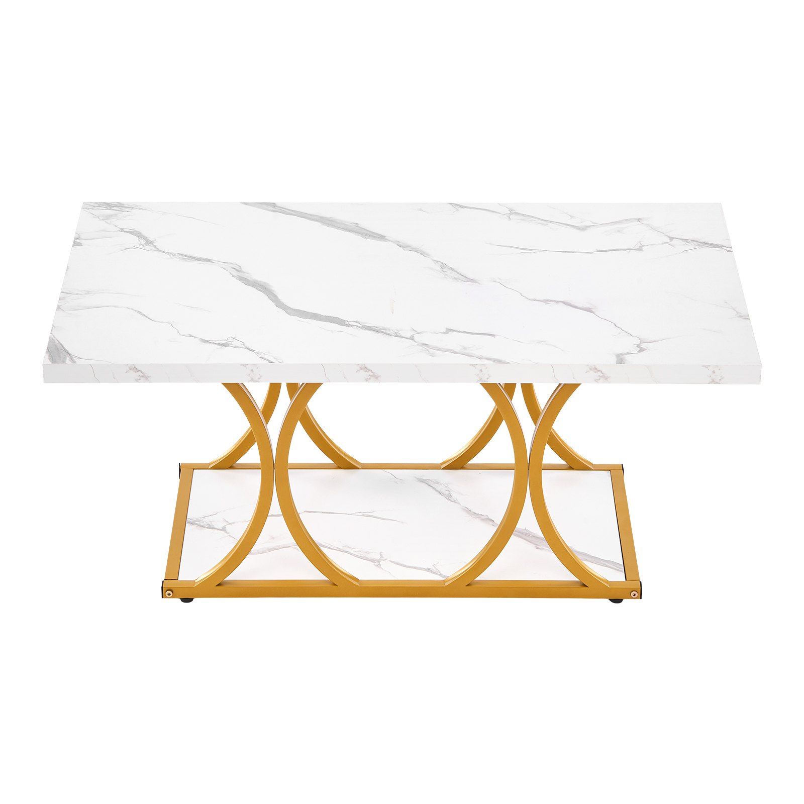 VEVOR Modern White Rectangle Faux Marble Coffee Table with 2-Tiers, Open Bottom Shelf and Gold Geometric Design Base