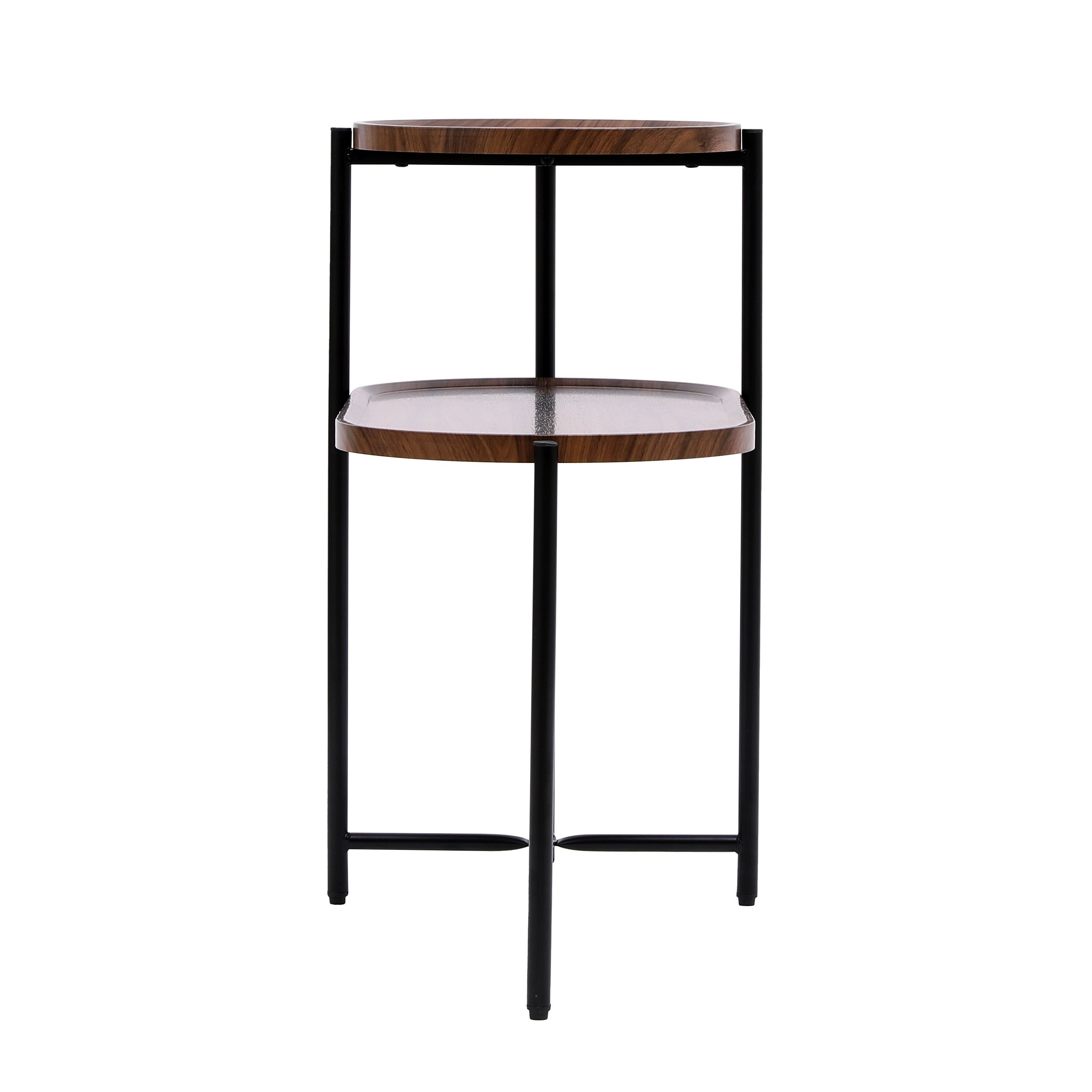 Walnut Brown 2 Tier Small Coffee Table, Round Top, Oval Bottom Wood Storage Shelf and X Shaped Metal Legs