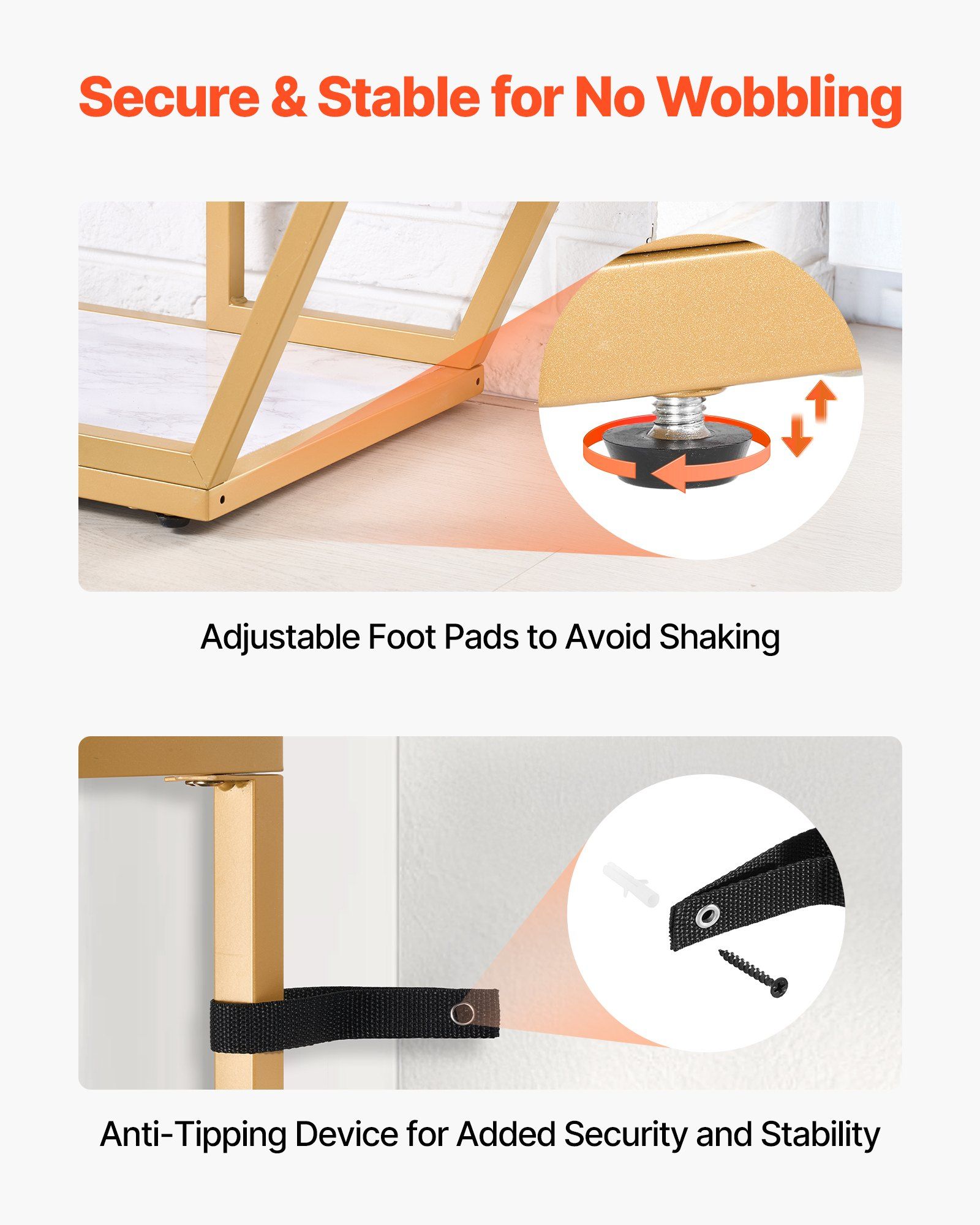 This white and gold 3-tier console table combines modern elegance with practical open storage. Its spacious tiered shelving provides generous room for décor, books, baskets, or everyday items. The sleek gold metal frame adds a luxurious touch and ensures long-lasting durability. Adjustable foot pads help keep the table level while protecting floors from scratches. Ideal for entryways, living rooms, offices, or hallways, this console table enhances organization and contemporary style.